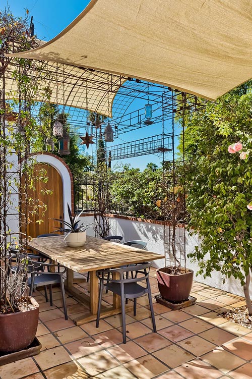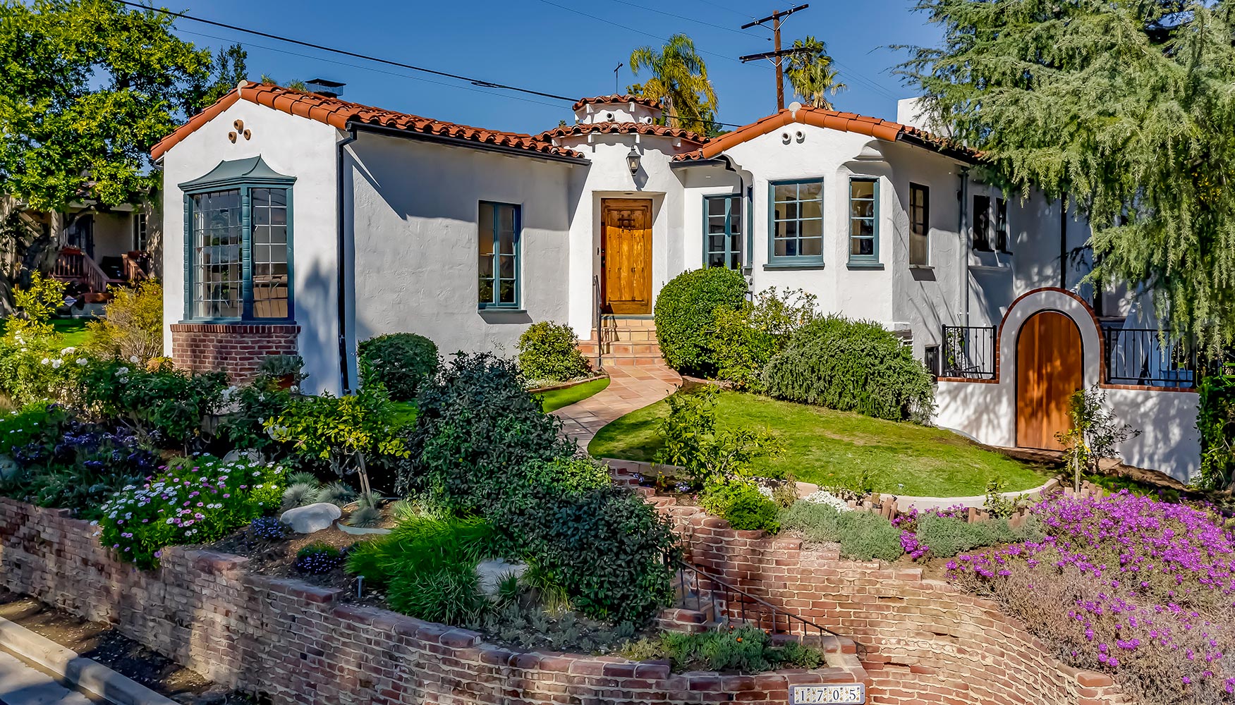 Set high above the street, this '30s character home enjoys a breathtaking window and balcony views of the LA skyline. Charming period details like arched entryways, hardwood floors and beamed ceilings blend seamlessly with upgrades like a fully remodeled kitchen and baths plus a new bath, all graced with Walker Zanger tiles. Windows everywhere frame leafy views, highlighted by a show-stopping 80-pane leaded glass bay window in the living room. French doors in the step-up octagonal dining room open to a sun-dappled terra cotta courtyard. Another generous patio enhances the upper level. A lower patio serves a separate room with bath and kitchenette. An outside staircase leads up from this area to the main kitchen. Meyer lemon, navel orange, satsuma, kumquat, and pomegranate trees highlight the grounds. The home features new wiring throughout, new HVAC, copper plumbing and foundation bolting. An upgraded two-car garage completes this timeless gem